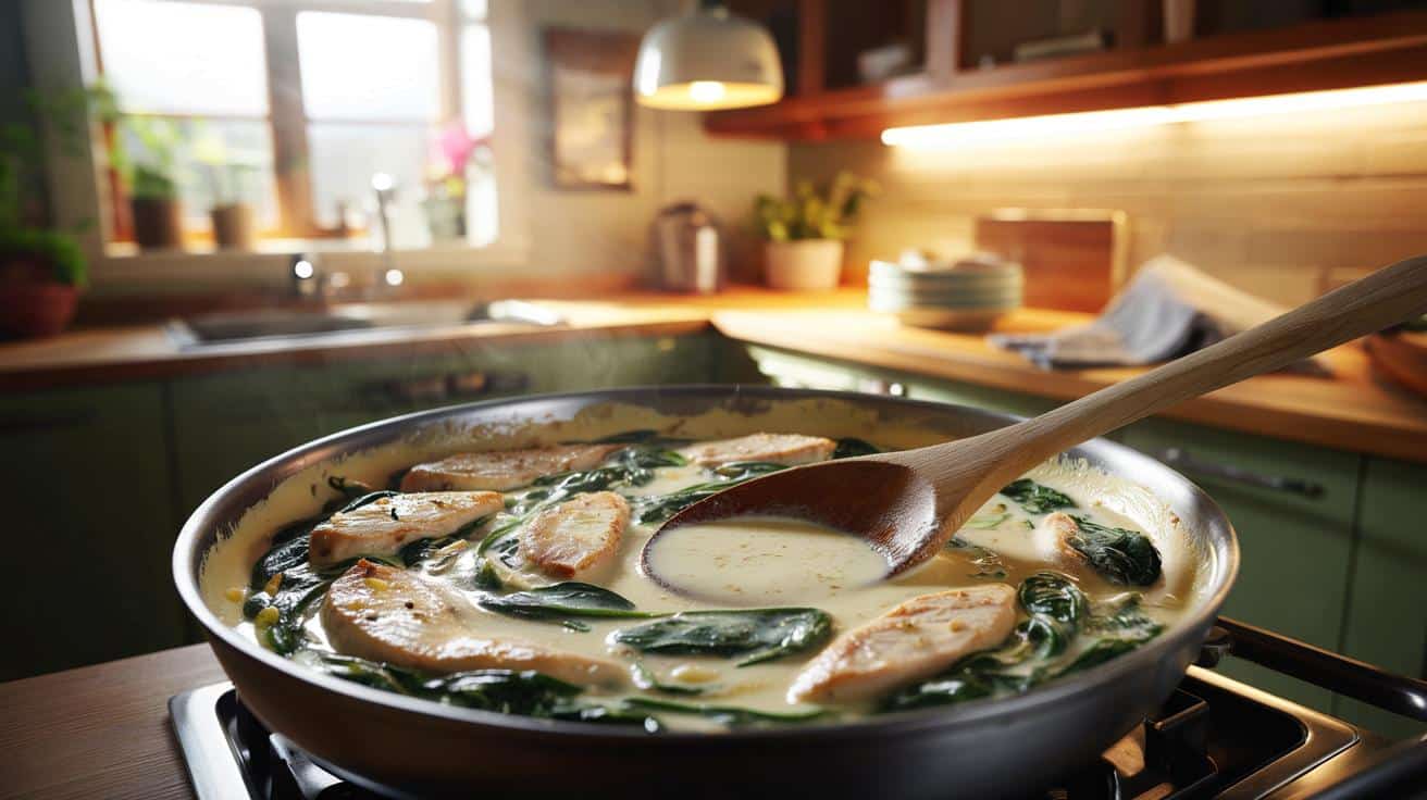 The pan was already hot when I started doubting myself. A weekday evening, brain fried from work, and I was staring at a handful of ingredients that looked… honestly, a bit sad. A carton of cream, a lonely chicken breast, half an onion, a small wedge of Parmesan, and some limp spinach I’d been ignoring for days. This did not look like the kind of dinner that fixes anything.